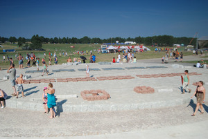 Skręciliśmy w alejkę i przechodząc się obok namiotów dotarliśmy do amfiteatru z kamienna mapą rozmieszczenia wojsk podczas pamiętnej bitwy. Zrobiliśmy kilka pamiątkowych zdjęć i wybraliśmy się w kierunku pomnika grunwaldzkiego, do którego nie doszliśmy ponieważ zniosło nas w kierunku pola bitwy.