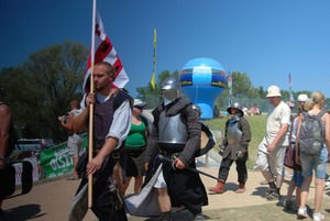 W końcu się znaleźliśmy. Dominik nastawił się na to, że go zbluzgam za to, że się zgubił. Ku jego zaskoczeniu przyjąłem jego powrót z uśmiechem na ustach. Śmiać mi się chciało, bo nie zastosowaliśmy się do podstawowych zasad i nie ustaliliśmy punktu i godziny spotkania na wypadek rozdzielenia się, które w takim tłumie jest rzeczą normalną. Liczyliśmy na to, że skoro każdy ma komórkę to się jakoś odnajdziemy niestety to był bardzo słaby pomysł. Napoiłem spragnionego kolegę i omówiliśmy nasze wspólne poszukiwania. Ku naszemu zdziwieniu okazało się, że na samym początku staliśmy ok. 15 metrów od siebie i wtedy pojawiły się już problemy z odnalezieniem się. Organizatorzy na wypadek zagubienia się głównym punktem spotkań dla osób zagubionych zrobili miejsce w okolicach pomnika grunwaldzkiego (w najbardziej nasłonecznionym miejscu na całym terenie) WIWAT ORGANIZATORZY!!! Dodatkowo powiadamianie o osobach zagubionych, które czekają na swoje pociechy i dzieci czekające na swoich rodziców pod pomnikiem były wygłaszane przez głośniki, które było słychać najdalej w okolicach pola bitwy. Jeżeli ktoś zagubił się gdzieś dalej lub znalazł przez przypadek poza polem bitwy nie miał szans dowiedzenia się o tym gdzie się stawić, by się odnaleźć. Dodatkowym niedociągnięciem organizacyjnym jest brak centralnie dostępnej mapy terenu z rozmieszczeniem imprez. Od samego rana ludzie błąkali się, by trafić na mszę albo na pole bitwy. Mnie osobiście interesowały 2 punkty programu. Inscenizacja bitwy oraz Flames of Night (festiwal ognia) na który z niecierpliwością oczekiwałem do godziny 21.30.