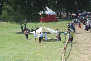Jak dojechaliśmy na miejsce przed wygrodzonym polem bitwy zebrało się w oczekiwaniu na godzinę 14tą już ok. 200 osób, które chciały mieć jak najlepsze miejsca. Z amfiteatru poszliśmy przez obozowiska harcerskie do drogi asfaltowej, którą to szliśmy w kierunku straganów. Zatrzymaliśmy się na jakiś posiłek przy jednym z barów. Po zjedzeniu bigosu i wypiciu jeszcze zmrożonej Nestea poszliśmy w dalszą drogę. Przeszliśmy przez litewskie stragany z upominkami i doszliśmy do pola bitwy z drugiej strony. Ludzi zbierało się coraz więcej. Przejazd drogami otaczającymi Pola Grunwaldu był prawie niemożliwy. Jak się później okazało doszło do takiej blokady, że co niektórzy utknęli w 30 km korkach i nie dotarli na inscenizację. Po Wizycie w toalecie i schłodzeniu się zimna wodą udaliśmy się w kierunku pola bitwy. Dominik stwierdził, że nie za dobrze czuje się na słońcu i na razie zostanie w cieniu. Ja jak zawsze na wariata rzuciłem się w kierunku miejsca inscenizacji. Było na tyle tłoczno, że przez 20 minut szukałem dogodnego miejsca do fotografowania. Znalazłem takie położenie że widziałem prawie wszystko ale tylko wtedy gdy nikt nie zasłaniał parasolami miejsca inscenizacji. Gdy rano przyjechaliśmy i było mało ludzi widzieliśmy porozstawiane głośniki wokół miejsca inscenizacji z których dobiegała bardzo przyjemna dla ucha muzyka średniowieczna. Pamiętam, że wtedy stwierdziłem że super nagłośnienie przygotowano. Niestety tak nie było już w czasie inscenizacji. Widocznie akustycy nie wzięli pod uwagę takiego ścisku. Dźwięk w systemie Dolby Prologic rozchodził się w śród tłumów jak bełkot dochodzący do ucha z różnym opóźnieniem z różnych stron. Aktorzy opisujący wydarzenia historyczne w czasie trwania inscenizacji przynajmniej w miejscu gdzie stałem byli niesłyszalni, a jak już coś dotarło to tylko bu... uuu... itp. W sumie szkoda prądu na lektora. Wytrzymałem na słońcu ok. 40 minut całej inscenizacji i uciekłem do cienia więc nie widziałem jak poległ Wielki Mistrz. Widziałem za to jak kilu rycerzy poległo na słońcu i zabrała ich karetka, która non stop krążyła na pole bitwy i do mdlejących widzów. Oczywiście nie jedna było ich kilkanaście, a wycie sygnałów zagłuszało nawet dźwięk walki. Szpital polowy był zorganizowany w bezpośredniej okolicy pola bitwy co spowodowało straszne utrudnienia w ruchu karetek, które przedzierały się przez tłum widzów, którzy by być bliżej zgromadzili się na wygrodzonej drodze do szpitala.