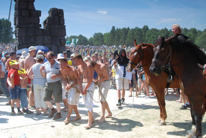 Wybraliśmy się z Dominikiem do ruin kaplicy wybudowanej w 1413r. na polu bitwy dla upamiętnienia śmierci Wielkiego Mistrza zakonu Urlicha Von Jungingena poległego w czasie sławiennej bitwy. Z ruin kaplicy wybraliśmy się w kierunku nam nie znanym, lecz jak się okazało słusznym. Idąc dookoła pola bitwy dotarliśmy przez przypadek do miejsca gdzie miała zostać odprawiona msza św. Usiedliśmy na amfiteatrze w oczekiwaniu na mszę. Upał był straszny a to dopiero niespełna godzina 10-ta. Wysiedzieliśmy na mszy ok. 15 minut i musieliśmy się ewakuować do cienia ponieważ mieliśmy wrażenie że ścina nam się białko w mózgach. Zastanawiam się czy jesteśmy tam mało odporni czy jest inny powód, że nie wytrzymaliśmy długo na słońcu. Jak radzą sobie ci którzy rezerwują miejsca przed polem bitwy i siedzą tam co najmniej od 7 rano.