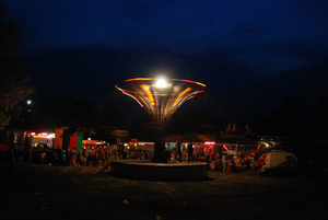 Zerwał się wiatr i w końcu się ochłodziło. Postanowiliśmy wracać do samochodu bo było już po 22-iej. W drodze powrotnej poszliśmy na "macanego" jakąś inną drogą i ku naszemu zdziwieniu chyba znaleźliśmy miejsce, gdzie odbywał się Flames of Night. Niestety była już taka godzina, że nawet jakbyśmy tam weszli to nie wiem czy widzielibyśmy 5 minut przedstawienia, które tak bardzo chciałem zobaczyć. Ominęliśmy to miejsce i wycieńczeni poszliśmy do samochodu przespać się przed drogą powrotną do domu (a przed nami ok. 5 godzin jazdy). Okazało się, że nadchodzi burza. Całe niebo dookoła nas co chwila się rozświetlało. Postanowiliśmy nie ryzykować spania pod drzewem tylko pojechania ile się da (początkowo ok 50km) i przespanie się na jakiejś stacji paliw. Taki byłem naładowany emocjami, że dojechałem do Łowicza. Tuż przed Łowiczem doznałem efektu "Black Dog"o którym opowiadał Patrick Swayze w filmie o tym samym tytule. Mimo iż czułem się dobrze zacząłem mieć omamy i widzieć jak coś ktoś wbiega mi na jezdnię. To był znak, że czas na odpoczynek. Wjechałem na najbliższą stację paliw i "przywaliłem w kimę". Początkowo myślałem o szybkiej 15 minutowej drzemce, ale organizm sam sobą pokierował i do tych 15 minut dodał jeszcze godzinę. Wyspany ruszyłem w dalszą drogę. po ok 10-15 minutach dopadła nas burza. Takiej ulewy nie pamiętam jak żyję. Widoczność spadła do 20-30m wycieraczki na "full". Pioruny tak waliły, że aż obudziły i postawiły do pionu Dominika. Wpatrzeni we dwóch w drogę po 10 minutach nagle wyjechaliśmy z tego oberwania chmury i szczęśliwie dojechaliśmy do domu.