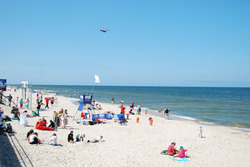 . Ciasna plaża i same małolaty. Pokręciliśmy się między straganami i pojechaliśmy do latarni morskiej w Gąskach. Niestety nie udało nam się wejść na latarnię, ponieważ kolejka chętnych zawijała się jak spirala ze trzy razy dookoła jej fundamentów. Odpuściliśmy sobie wejście i poszliśmy na plażę. Tu raczej spokojnie pogoda się polepszyła zdecydowanie. Jak dojechaliśmy do Milena zanosiło się na pochmurny dzień. W Gąskach było już słonecznie i morze się rozruszało - zaczęły się pojawiać pierwsze fale.