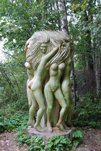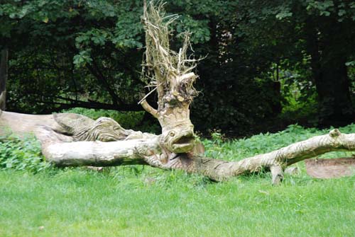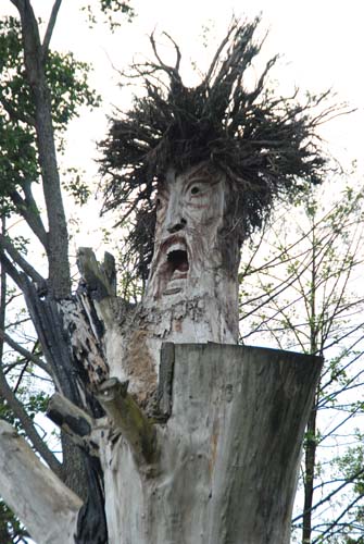 Za samą bramą wielki parking w okół którego mnóstwo poprzewracanych drzew jak po jakimś huraganie. Drzewa te nie są przypadkowe są to rzeźby węży i innych gadów. Za parkingiem żeby wejść na teren trzeba niestety zapłacić. Hmm.. z tego wrażenia nie pamiętam nawet ile,chyba 5 zł ale nie wiem czy za naszą dwójkę dorosłych czy od osoby. Pani kasująca nas na wejściu jest niekonwencjonalnie ubrana. Jakieś skówy z niedźwiedzia, długa suknia itp. Strój niczym z przed 2000 lat. Weszliśmy na teren, wszędzie pełno rzeźb nawet ptaki na drzewach są wyrzeźbione. Wieść niesie że właściciel wielki Yzeggus II znany jako Cezary Kubacki znany z tego, że zajmował się psychiatrią i wykręcił ten świat do góry nogami. Prawda jest taka że przewija się tam kilkaset, a może i kilkatysięcy osób w ciągu doby chcących zobaczyć ten zakątek. Cóż miał facet pomysł na bizne, ale naprawdo warto zobaczyć to miejsce.